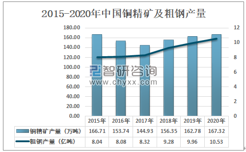 根据国家统计局及中国有色金属工业协会数据:2020年中国铜精矿产量为167.32万吨,同比增长了4.54万吨;粗钢产量为10.53亿吨,同比增长了0.57亿吨。