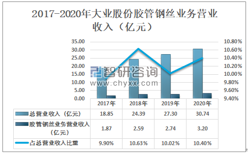 2020年大业股份总营业收入为30.74亿元,其中胶管钢丝业务营业收入为3.2亿元,占总营业收入的10.40%。