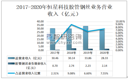 2020年恒星科技总营业收入为28.33亿元,其中胶管钢丝业务营业收入为2.14亿元,占总营业收入的7.55%。