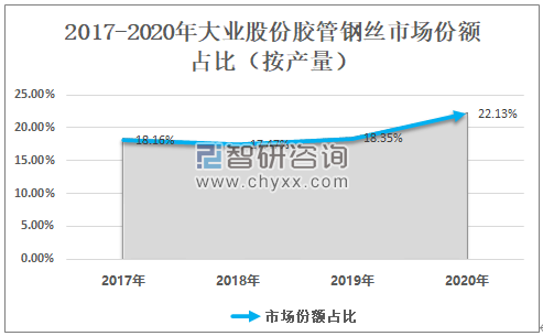 2018年以来,大业股份胶管钢丝市场份额占比不断提升,2020年大业股份胶管钢丝市场占有率为22.13%,较2019年增长了3.78个百分点。