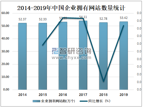 总体来看中国企业拥有网站数量较为稳定,2019年中国企业拥有网站数量为53.42万个,较2018年增加了0.63万个,同比增长1.20%。