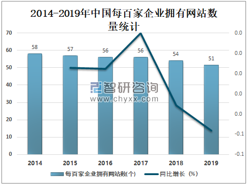 自2015年起中国每百家企业拥有网站数量逐年减少,2019年中国每百家企业拥有网站数量为51个,较2018年减少了2.6个,同比减少4.81%。