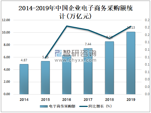 随着中国企业电子商务销售额的增加,电子商务采购额也随着增加,2019年中国企业电子商务采购额达10.13万亿元,较2018年增加了1.57万亿元,同比增长18.32%。