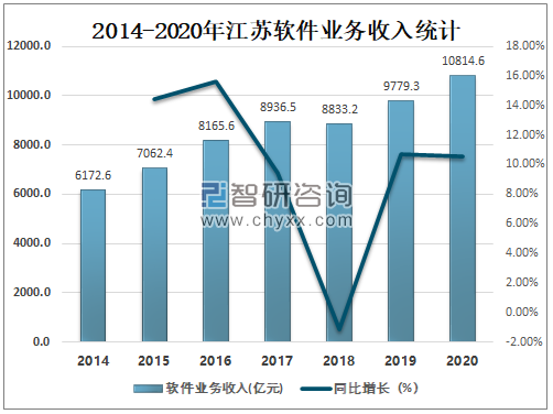 智研咨询发布的《2021-2027年中国软件行业市场发展潜力及投资盈利分析报告》数据显示:随着现代信息技术的日益普及和互联网产业的高速发展,软件产业已成为国民经济的战略性、先导性和支柱性产业,软件产业将会成为衡量一个地区综合实力的标志之一,2020年江苏软件业务收入达10814.6亿元,较2019年增加了1035.29亿元,同比增长10.59%。