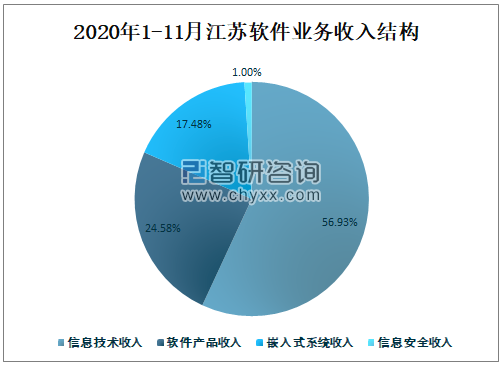 2020年1-11月江苏信息技术收入占江苏软件业务总收入的56.93%,占比最大;软件产品收入占江苏软件业务总收入的24.58%;嵌入式系统收入占江苏软件业务总收入的17.48%;信息安全收入占江苏软件业务总收入的1%。