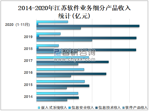 从细分产品来看,2020年1-11月江苏软件产品收入为2383.37亿元;信息技术收入为5520.33亿元;信息安全收入为97.03亿元;嵌入式系统收入为1695.12亿元。
