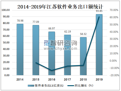 在出口方面,2019年江苏软件业务出口额达93.85亿美元,较2018年增加了35.54亿美元,同比增长60.94%。