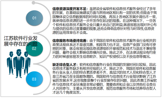 目前江苏软件行业发展中存在的问题主要有:信息资源深度开发不足、信息服务市场亟待完善、缺乏综合型人才等。