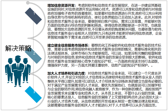 面对江苏软件行业发展中存在的问题,解决策略主要有:增加信息资源开发、建立健全信息服务市场体系、加大人才培养和引进力度等。