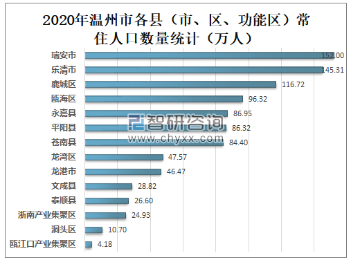 2020年瑞安市常住人口数量为152万人;乐清市常住人口数量为145.31;鹿城区常住人口数量为116.72。