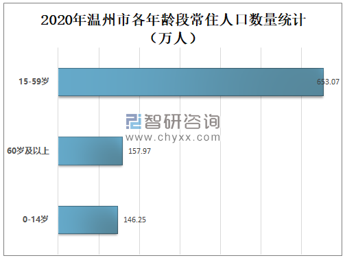 常住人口中,2020年温州市15-59岁常住人口数量为653.07万人;60岁及以上常住人口数量为157.97万人;0-14岁常住人口数量为146.25万人。