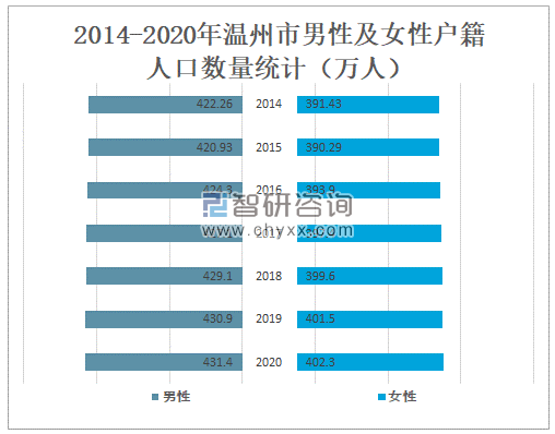 2020年温州市男性户籍人口数量为431.4万人,较2019年增加了0.5万人;女性户籍人口数量为402.3万人,较2019年增加了0.8万人。