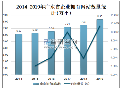 自2015年起广东省企业拥有网站数量逐年增加,2019年广东省企业拥有网站数量达8.36万个,较2018年增了0.86万个,同比增长11.54%。