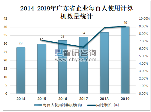 智研咨询发布的《2021-2027年中国企业信息化行业市场行情动态及发展前景展望报告》数据显示:2019年广东省企业每百人使用计算机数量达40台,较2018年增加了3.34台,同比增长9.04%。
