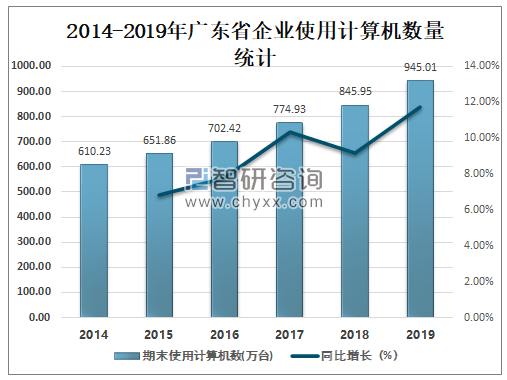 2014-2019年广东省企业使用计算机数量统计