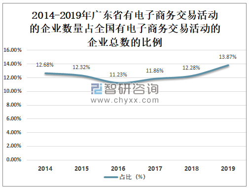 自2017年起广东省有电子商务交易活动的企业数量占全国有电子商务交易活动的企业总数的比例逐年攀升,2019年广东省有电子商务交易活动的企业数量占全国有电子商务交易活动的企业总数的13.87%,较2014年的12.68%增长了1.19%。