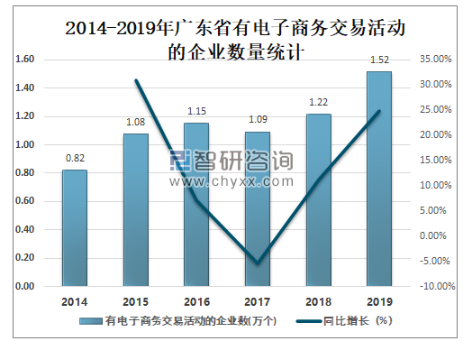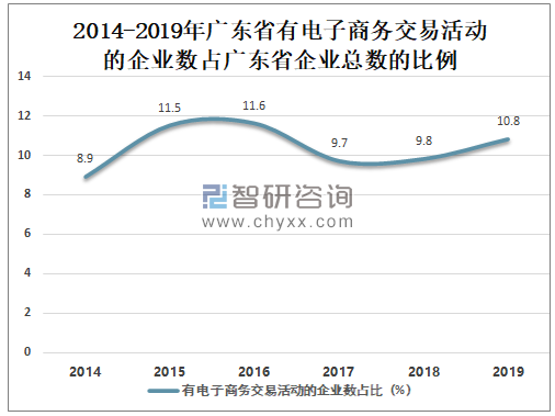总体来看广东省有电子商务交易活动的企业数占广东省企业总数的比例呈增长趋势,2019年广东省有电子商务交易活动的企业数占广东省企业总数的10.8%,较2014年的8.9%增长了1.9%。