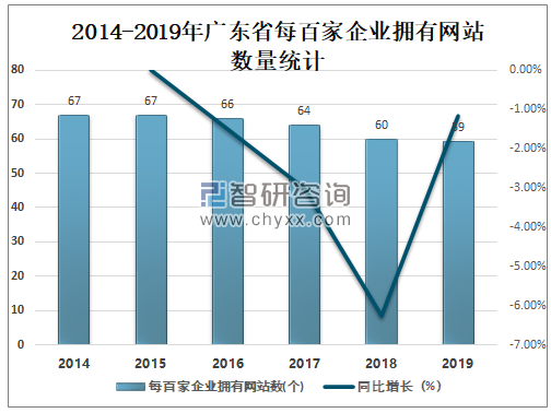 自2016年起广东省每百家企业拥有网站数量逐年减少,2019年广东省每百家企业拥有网站数量为59个,较2018年减少了1个,同比减少1.17%。