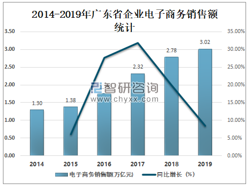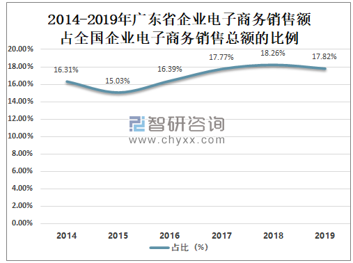 自2016年起广东省企业电子商务销售额占全国企业电子商务销售总额的比例逐年攀升,2019年广东省企业电子商务销售额占全国企业电子商务销售总额的17.82%,较2014年的16.31%增长了1.51%。