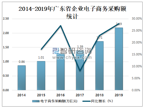 在广东省企业电子商务销售额增长的同时,电子商务采购额也在增加,2019年广东省企业电子商务采购额达2.19万亿元,较2018年增加了0.48万亿元,同比增长28.05%。