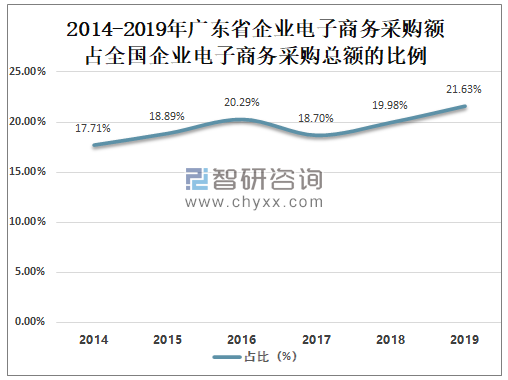总体来看广东省企业电子商务采购额占全国企业电子商务采购总额的比例呈增长趋势,2019年广东省企业电子商务采购额占全国企业电子商务采购总额的21.63%,较2014年的17.71%增长了3.91%。