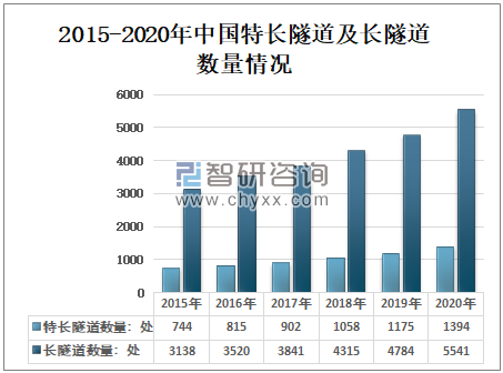 2015-2020年中国特长隧道及长隧道数量均呈逐年增长态势,2020年中国特长隧道数量1394处,较2019年增长219处;长隧道数量5541处,较2019年增长757处。
