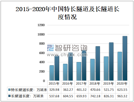 现阶段,我国特长隧道及长隧道长度工程建设规模持续扩大,2020年中国特长隧道长度623.55万延米,同比增长19.51%;长隧道长度963.32万延米,同比增长16.58%。