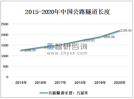 隧道是缓解城市交通拥堵的必要手段,2015年以来,中国公路隧道长度呈直线上升,至2020年中国公路隧道长度2199.93万延米,同比增长15.99%。