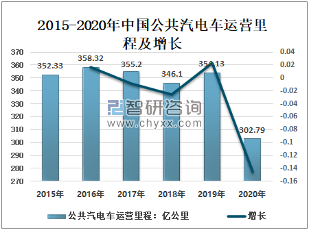 2015-2020年中国公共汽电车运营里程总体保持在300-360亿公里之间,2020年中国公共汽电车运营里程302.79亿公里,同比下降14.50%。