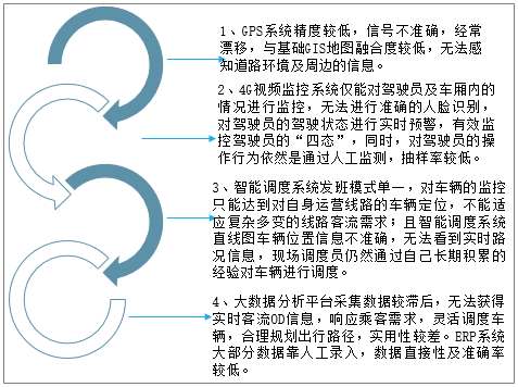 目前,安全方面,公交已成熟运用了GPS系统及4G视频监控系统,对车辆运行轨迹、运行速度、驶员状态及操作行为进行实时监控预警;营运方面,公交已运用了智能调度系统,对车辆实际运行情况及班次间隔进行实时观测,并对车辆实际运营公里进行统计;机务方面,CAN总线系统可对车辆气耗、油耗、电耗等方面进行监测,该系统正在调试,尚未投入使用。