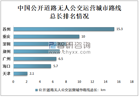 目前,中国已有苏州、重庆、深圳、郑州、广州、海口、天津7座城市部署有在公开道路运营的无人公交路线。从中国公开道路无人公交运营城市路线总长来看,苏州公开道路无人公交运营城市路线总长15.3km,位于全国第一;其次是重庆,公开道路无人公交运营城市路线总长10km;第三是深圳,公开道路无人公交运营城市路线总长8km。