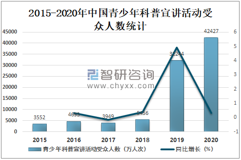 智研咨询发布的《2021-2027年中国教育产业发展动态及未来趋势预测报告》数据显示:自2018年起中国青少年科普宣讲活动受众人数逐年增加,2020年中国青少年科普宣讲活动受众人数达42427万人次,较2019年增加了10183万人次,同比增长31.58%。