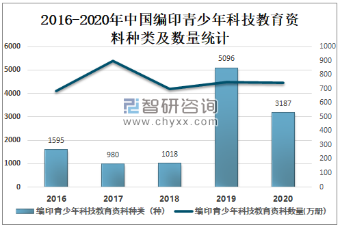 2020年中国编印青少年科技教育资料种类为3187种,较2019年减少了1909种;编印青少年科技教育资料数量为743.6万册,较2019年减少了4.2万册。