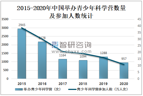 2020年中国共举办青少年科学营957次,较2019年减少了331次;青少年科学营参加人数为10.8万人次,较2019年减少了5.2万人次。