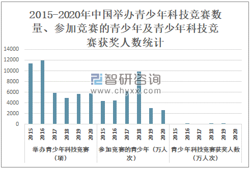 2020年中国共举办青少年科技竞赛5785项,较2019年增加了105项;参加竞赛的青少年为2625.6万人次,较2019年减少了431万人次;青少年科技竞赛获奖人数为130.9万人次,较2019年减少了10万人次。