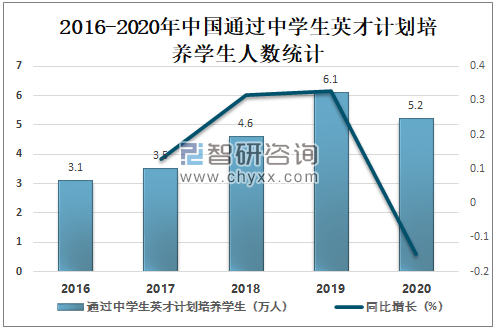 自2017年起中国通过中学生英才计划培养学生人数逐年增加,2019年中国通过中学生英才计划培养学生人数达6.1万人,较2018年增加了1.5万人,同比增长32.61%,2020年较2019年有所下滑,2020年中国通过中学生英才计划培养学生人数为5.2万人,较2019年减少了0.9万人,同比减少14.75%。