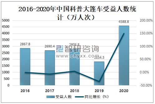 2020年中国科普大篷车受益人数大幅增加,2020年中国科普大篷车受益人数达4588.8万人次,较2019年增加了2754.5万人次,同比增长150.17%。