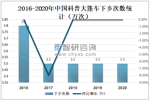 智研咨询发布的《2021-2027年中国教育行业市场竞争现状及发展趋势分析报告》数据显示:自2017年起中国科普大篷车下乡次数非常平稳,2020年中国科普大篷车下乡次数3.5万次,与2019年持平。