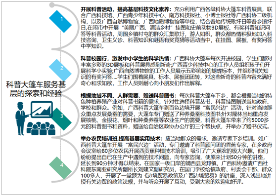 近几年来,为深入实施《全民科学素质行动计划纲要》,大力推动科普工作改革创新,广西科协组织科普大篷车“月月行”、乡村农寨“万里行”活动,结合当地的生产生活实际,开展群众性的科普活动,为科普大篷车开展基层科普服务进行了有益的探索和实践,取得了良好的成效。