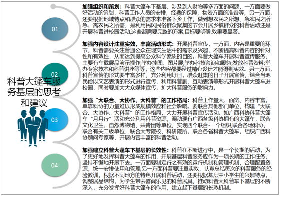 科普大篷车下基层开展科普服务一直以来都是科协开展科普宣传的主要方式,多年来,都是各级科协自己开展,没有形成统一的规划,基层科协的科普资源较少、科普经费投入少、整合科普资源的能力弱等因素都严重制约和影响各级科协科普大篷车下基层服务的开展。结合广西科协开展科普大蓬车“月月行”,乡村农寨“万里行”活动的情况,为了更好发挥科普大篷车的作用,开展基层科普服务,应从以下几个方面进行加强。