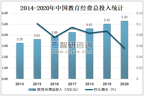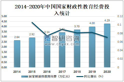 智研咨询发布的《2021-2027年中国教育行业市场竞争现状及发展趋势分析报告》数据显示:我国教育经费投入制度的改革,逐渐实现了从政府单一投入到以政府投入为主多渠道共存的教育经费体制,较大改变了教育经费严重短缺的局面,支撑了教育改革和教育事业的巨大发展。但长期以来国家财政性教育经费投入仍然占主导地位,2020年中国国家财政性教育经费投入达4.29万亿元,较2019年增加了0.28万亿元,同比增长7.1%。