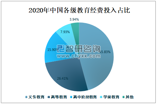 2020年中国义务教育经费投入占全国教育经费总投入的45.83%,占比最大;高等教育经费投入占全国教育经费总投入的26.41%;高中阶段教育经费投入占全国教育经费总投入的15.90%;学前教育经费投入占全国教育经费总投入的7.93%。