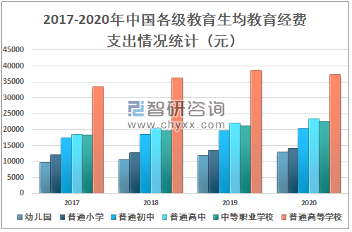 2020年中国幼儿园教育生均教育经费支出为12954元,较2019年增加了1099元;普通小学教育生均教育经费支出为14103元,较2019年增加了610元;普通初中教育生均教育经费支出为20342元,较2019年增加了780元;普通高中教育生均教育经费支出为23489元,较2019年增加了1374元;中等职业学校教育生均教育经费支出为22568元,较2019年增加了1365元;普通高等学校教育生均教育经费支出为37241元,较2019年减少了1440元。