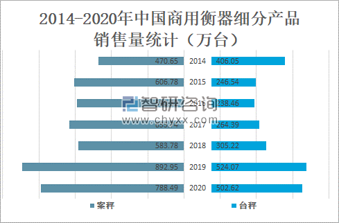 2014-2020年中国商用衡器细分产品销售量统计(万台)