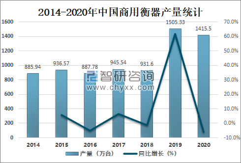 中国商用衡器行业是一个具有漫长发展历史的传统产业和重要的基础行业。改革开放后,中国商用衡器行业有了较快的发展,2019年中国商用衡器产量达1505.33万台,较2018年增加了573.73万台,同比增长61.6%,2020年较2019年有所下滑,2020年中国商用衡器产量为1415.5万台,较2019年减少了89.83万台,同比减少6.0%。