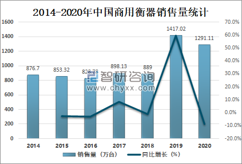 2020年中国商用衡器销售量较2019年有所下滑,2020年中国商用衡器销售量为1291.11万台,较2019年减少了125.91万台,同比减少8.9%。