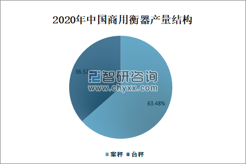 2020年中国案秤产量占商用衡器总产量的63.48%,占比较大;台秤产量占商用衡器总产量的36.52%,占比较小。