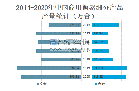 智研咨询发布的《2021-2027年中国衡器行业竞争格局分析及市场需求前景报告》数据显示:从细分产品来看,2020年中国案秤产量为898.62万台,较2019年减少了67.78万台;台秤产量为516.88万台,较2019年减少了22.05万台。