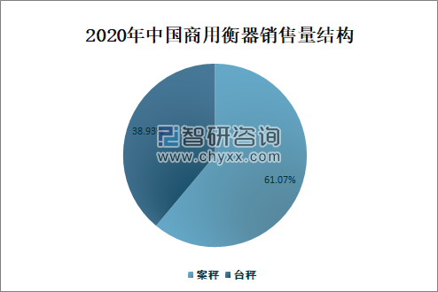 2020年中国案秤销售量占商用衡器销售总量的61.07%,占比非常大;台秤销售量占商用衡器销售总量的38.93%,占比较小。