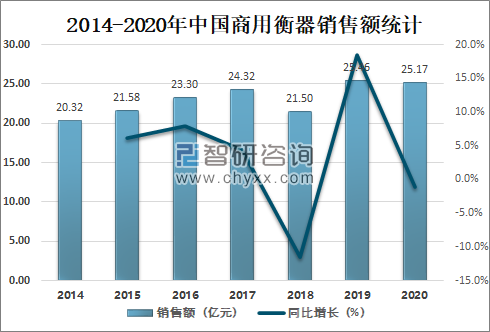 随着2020年中国商用衡器销售量的减少,销售额也随之减少,2020年中国商用衡器销售额为25.17亿元,较2019年减少了0.29亿元,同比减少1.2%。